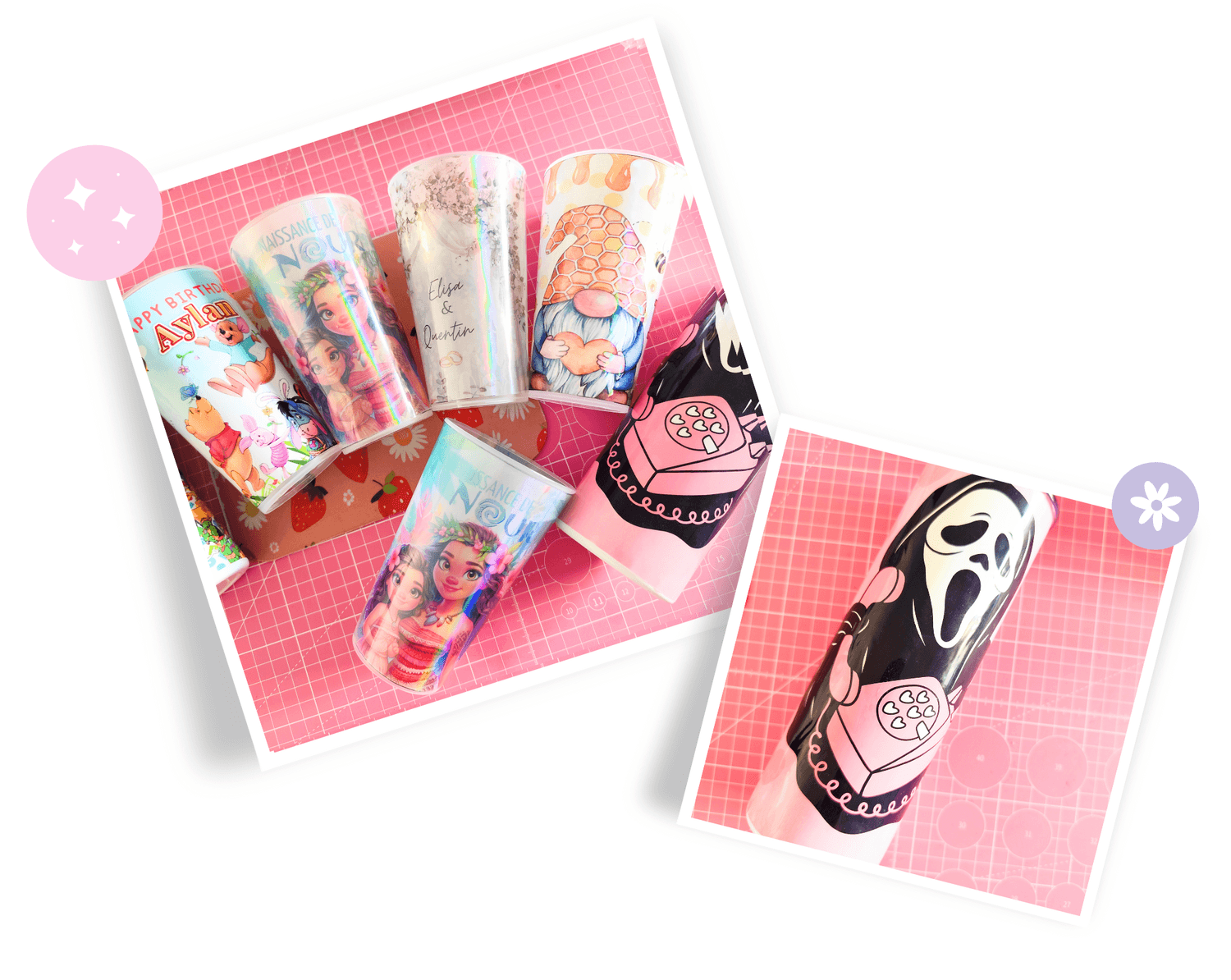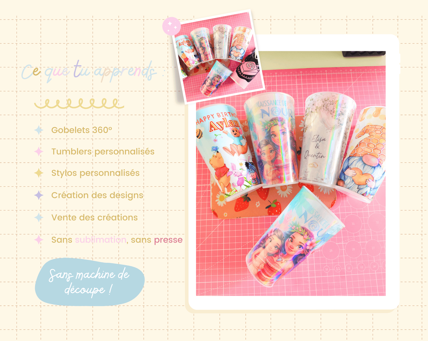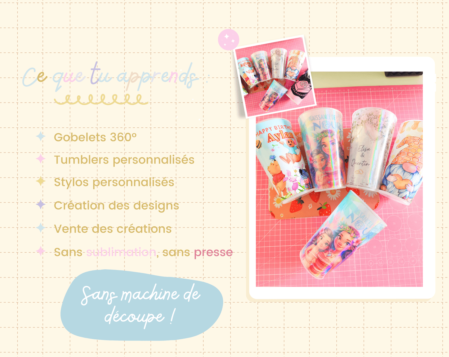 Tu apprendras à maitriser de A à Z la création des designs pour tes gobelets, tumblers, stylos..ou n'importe quel support de ton choix.